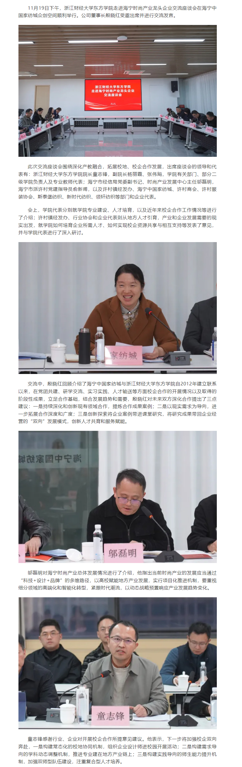 公司董事长殷晓红受邀参加浙江财经东方学院走进海宁时尚产业龙头企业交流座谈会并发言